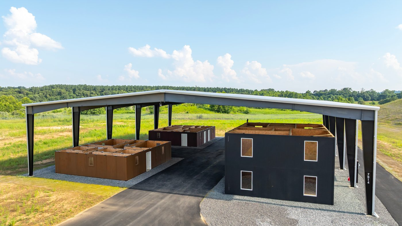 A canopied outdoor training site containing a road network and four urban type SIM houses rated for non-ballistic simulated ammunition featuring interchangeable walls. One house is capable of being flooded with non-toxic smoke.